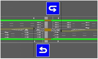 在交通工程設(shè)計中,為滿足路段車輛掉頭通行需求,可根據(jù)條件在路段渠化允許掉頭車道。城市快速路、無中央分隔帶的主干道上嚴(yán)禁設(shè)置路段掉頭,在設(shè)置車輛掉頭車道時,應(yīng)保證其對向交通為非飽和流量狀態(tài),同時道路寬度應(yīng)能滿足區(qū)域準(zhǔn)許通行的最大車輛掉頭行駛最低尺寸。以下列出路段允許掉頭的幾種設(shè)計方法和施策,供同行參考: