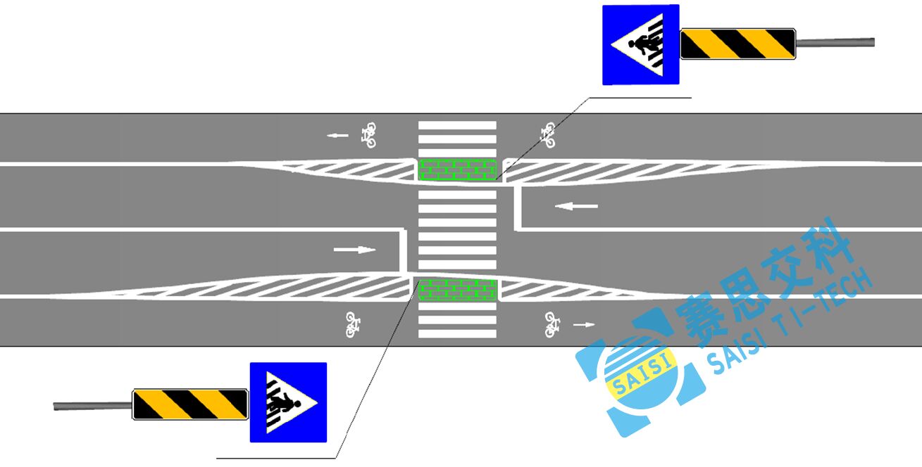 通過增設實體安全島及上游車道寬度進行壓縮,強制車輛減速行駛,提高行人過街的安全性。兩端設置人行橫道指示標志,建議采用主動發光工藝,提升標志的遠距離視認性,和動態警示性。