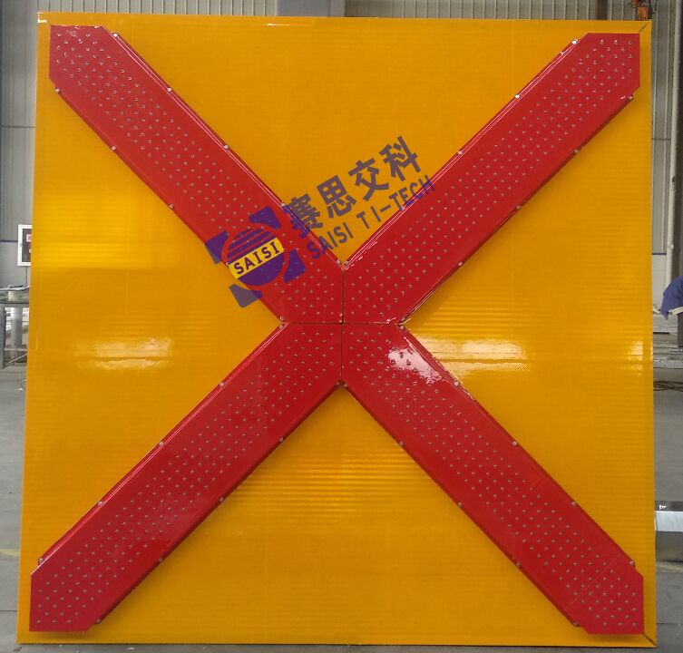 技術參數:尺寸2000mm*2000mm;黃底、紅圖案、紅色LED管;LED點陣式主動發光標志;太陽能供電或外接市電。