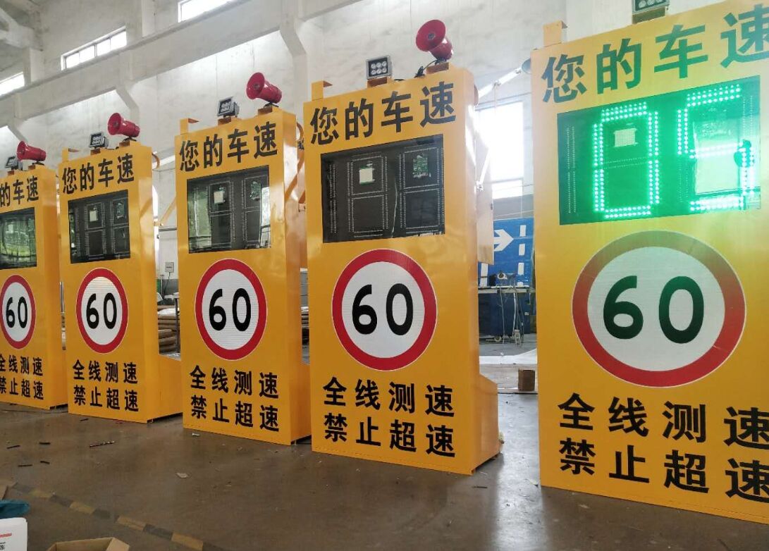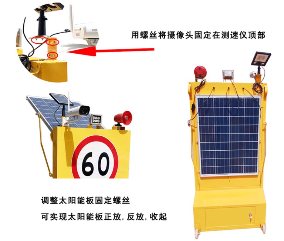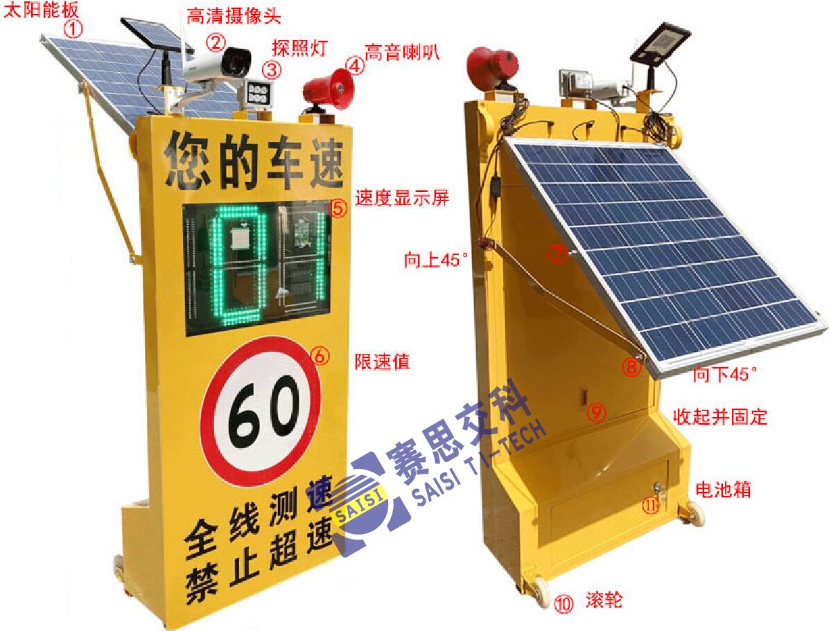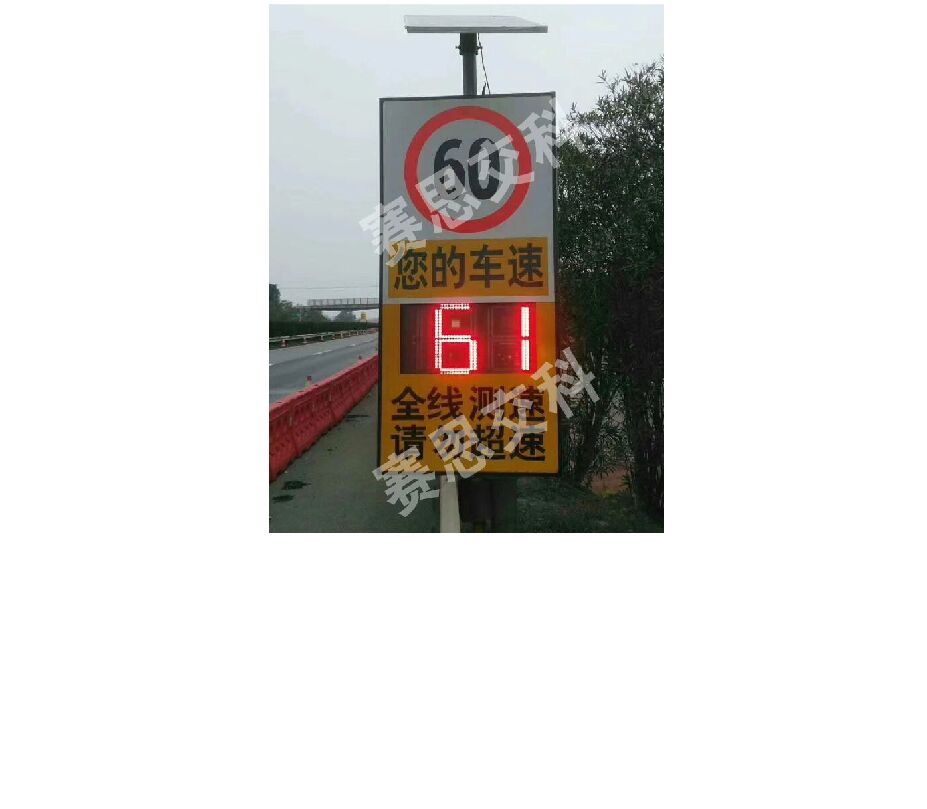 1、標志整體為立體裝置平臺,主要包括:語音警示喇叭、速度條碼顯示屏、視頻記錄攝像頭、太陽能蓄電池供電系統等設備。當被測車輛通行車速超過限制速度時,速度條碼顯示屏以紅色顯示當前車速,并啟動語音警示喇叭告知車輛以超速行駛;當被測車輛通行車速超過限制速度時,速度條碼顯示屏以綠色顯示當前車速。攝像頭全天候記錄路段動態視頻,夜間開啟補光燈。該裝置對車輛超速行駛行為有較高的警示效果、特別適用于事故易發路段、團霧頻發路段、需加強管理路段。