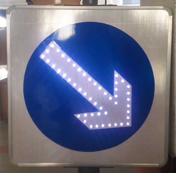 指示類道路交通發光標志牌,其主要功能為對特定通行行為、通行屬性的指示與限定。如“機動車與非機動車分道標志”、“右下行通行標志”、“向右轉彎標志”、“線性誘導標志”、“單行線指示標志”、“環島指示標志”、“人行橫道指示標志”等。其形狀主要為長方形或方形;其顏色:城市道路主要為藍底白色圖案;快速路、高速路為綠底白色圖案。該類標志,通常選用“全透面板型主動發光標志”、“外置點陣型主動發光標志”等類型。