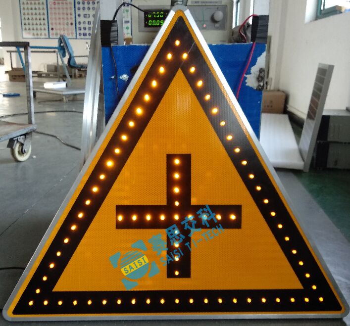 在未設置信號燈的畸形交叉口,常常由于優先通行路權沒有明確,車輛會車時,極易發生碰撞事故,可以通過設置“停”字、“讓”字、“慢”字等公路發光標志牌,和必要的路權分配指引標志(如:“太陽能右下行發光警示柱”等),明確各方向的優先路權,同時公路發光標志牌具備遠距離的視認性,讓不同方向的交通流能遠距離發現前方交叉口的路權分配信息。
