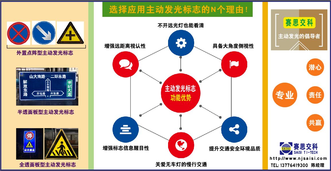 南京賽思交通信息科技有限公司,通過大量的光學測試、工藝研討,根據不同城市的標志版面、應用場景,給出特定的發光標志工藝設計參考標志,旨在為您的城市量身設計出適合你城市現狀的主動發光標志,讓主動發光標志的應用效果能得到淋漓盡致地發揮,并具備持續、耐久的優良品質。更多技術性專題研究,可登錄網址(http://m.nm131.com)查閱,或致電:陳經理,13776419300(微信同號),您的積極參與及意見反饋,就是我們持續研究主動發光標志的最大動力!