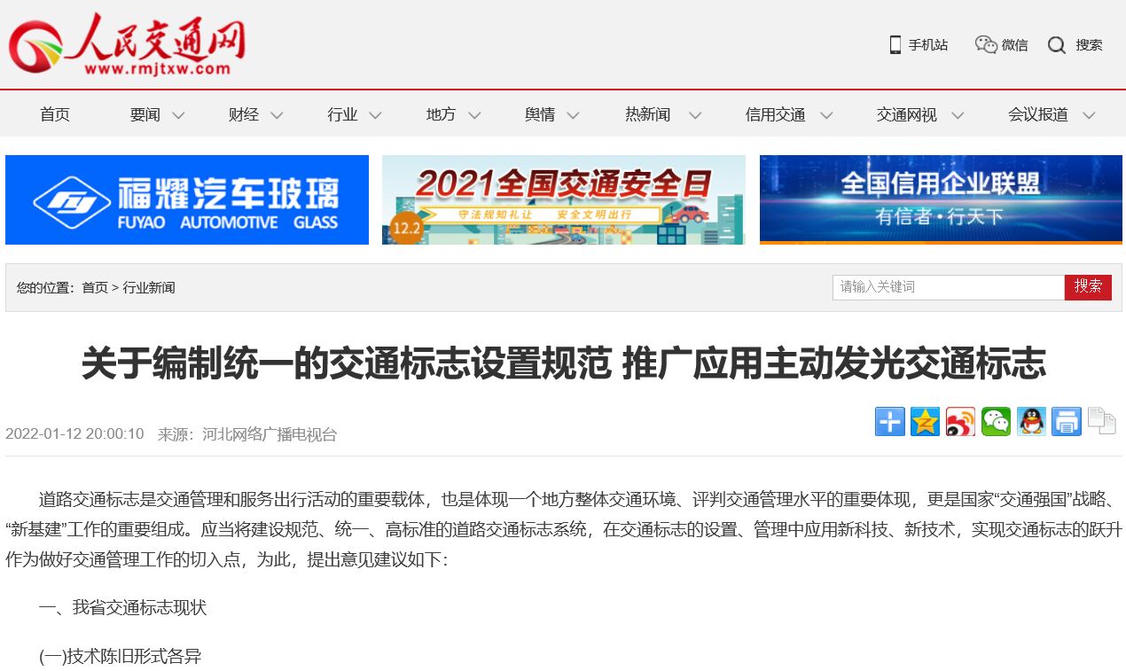 附件:“人民交通網”2022年1月12日發文《關于編制統一的交通標志設置規范 推廣應用主動發光交通標志》截圖。