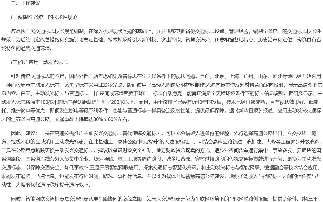主動發光標志,因其具備獨特的功能優勢,主要有:(1)能主動發光,不需依賴汽車遠光燈照射;(2)提升標志的遠距離視認性;(3)增強標志的易捕捉性和警示性;(4)增強標志在雨、霧、冰、雪、霾、逆光等惡劣交通環境中,仍能保持良好的顯示效果。上述功能能彌補在特殊交通環境中普通逆反射標志的功能不足現象。為此,文中還給出相關建議:“一是在高速按需推廣主動發光交通標志替代傳統交通標志。可以充分借鑒先進省份的經驗,先行選擇高速公路出口、立交樞紐、隧道、視線不良的區域采用主動發光標志。在此基礎上,高速公路“視距提升”納入建設標準,并可結合高速公路新建、改擴建、大修等工程逐步升級改造;二是在公路重點路段更換主動發光交通標志。建議以省級財政資金補貼,地方財政資金配套的方式,逐步對夜間貨車通行集中、事故多發、易擁堵的國省道路段,國省道沿線勞務人員集中企業、貨運場站、施工工地等周邊路段,城鄉結合部、穿村過鎮路段的傳統交通標志牌進行升級,更換為主動發光交通標志,以保障交通安全,降低事故率;三是開展智能網聯應用,探索交通標志智慧化升級。將主動發光標志與智能網聯、數據融合等技術結合應用,既能發布道路、節點信息,也能發布行程時間、路況、事件等信息。并以此為載體開展智慧高速公路建設,增強了駕駛人與指路標志之間的信任度與互動性,大幅度優化通行秩序提升通行效率。”