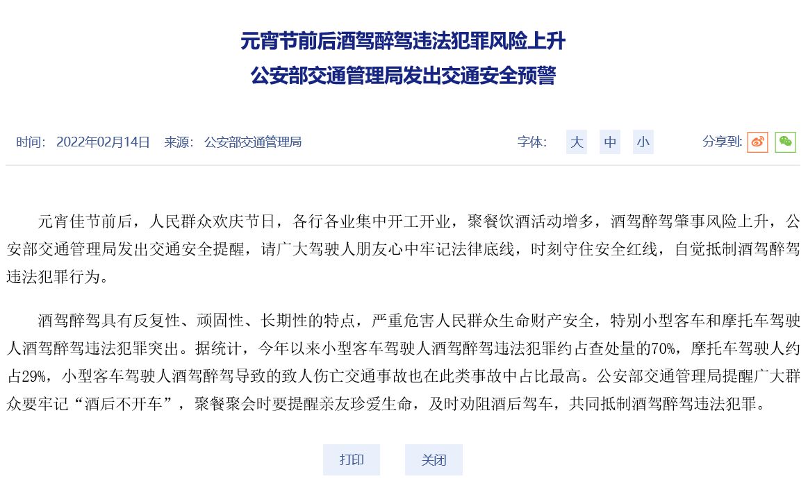 元宵節慶祝應牢記酒后不開車,公安部交通管理局發出交通安全預警