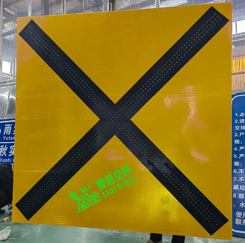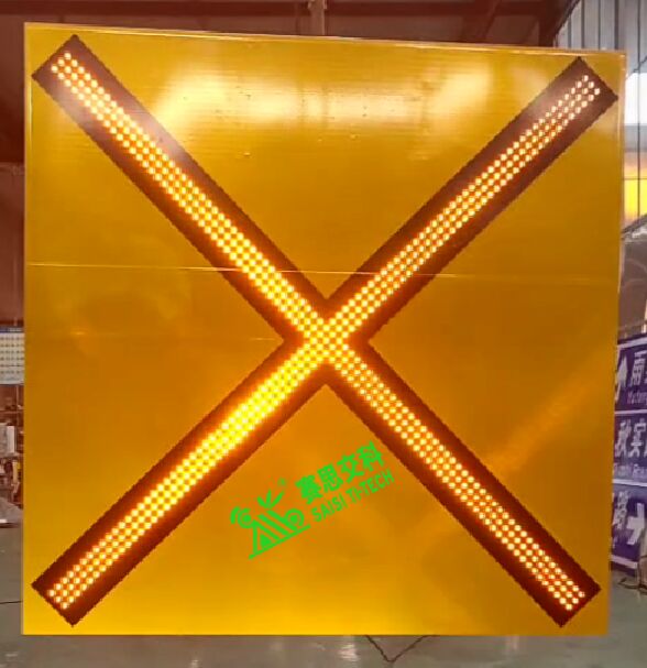 發(fā)光禁航標(biāo)志的整體形狀為方型,版面為黃色底膜,黑色叉形圖案,通常采用2000mm*2000mm,或2400mm*2400mm尺寸;主要設(shè)置于橋孔上方,表示該橋孔僅為對向航道通航方向,本方向?yàn)榻椒较颍坏猛ㄐ小8鶕?jù)國標(biāo)《中國海區(qū)可航行水域橋梁助航標(biāo)志》(GB 24418)的技術(shù)要求,版面圖標(biāo)如下: