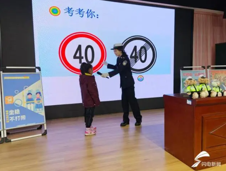“生動活潑,入腦入心”。民警通過ppt為同學們介紹了各種常見的交通標志、標線,例如“一盔一帶”,“安全帶是生命帶”、“細觀察,不猛跑”等。同時,民警還開展了有獎互動,為答對問題的小朋友送上交通安全文創(chuàng)產品。