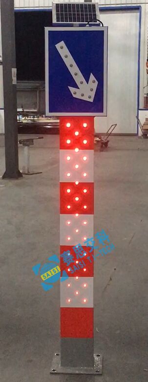 2、基本說明:采用一體式柱體結構,標志版面圖案中嵌入LED發光管,柱體上設置警示發光管,采用太陽能蓄電池供電,設置于中央隔離帶端口。