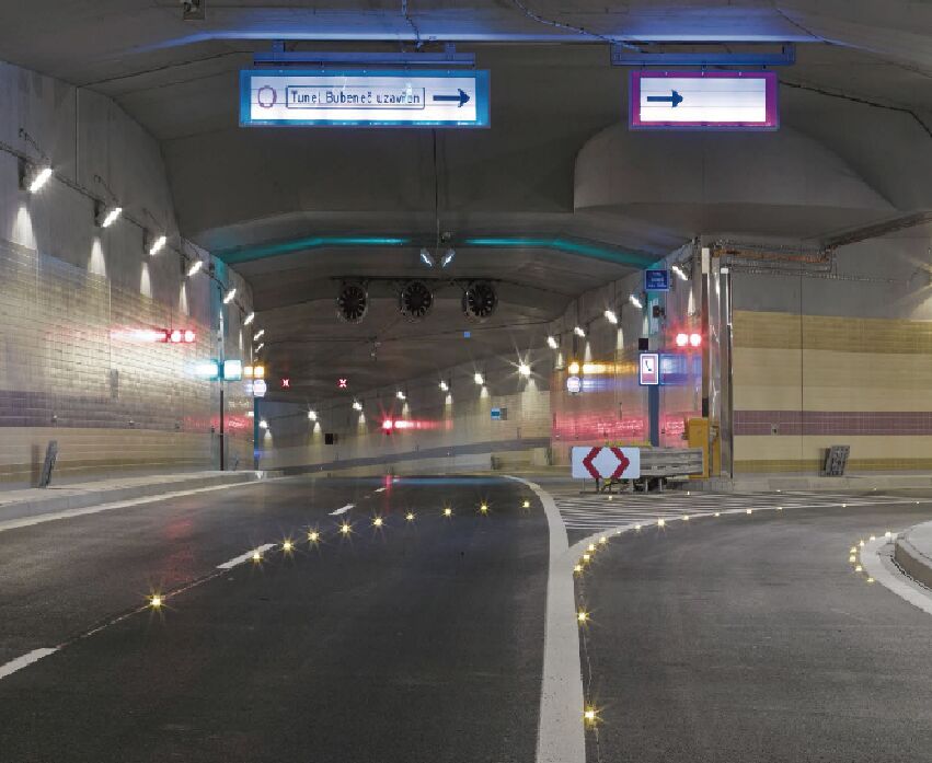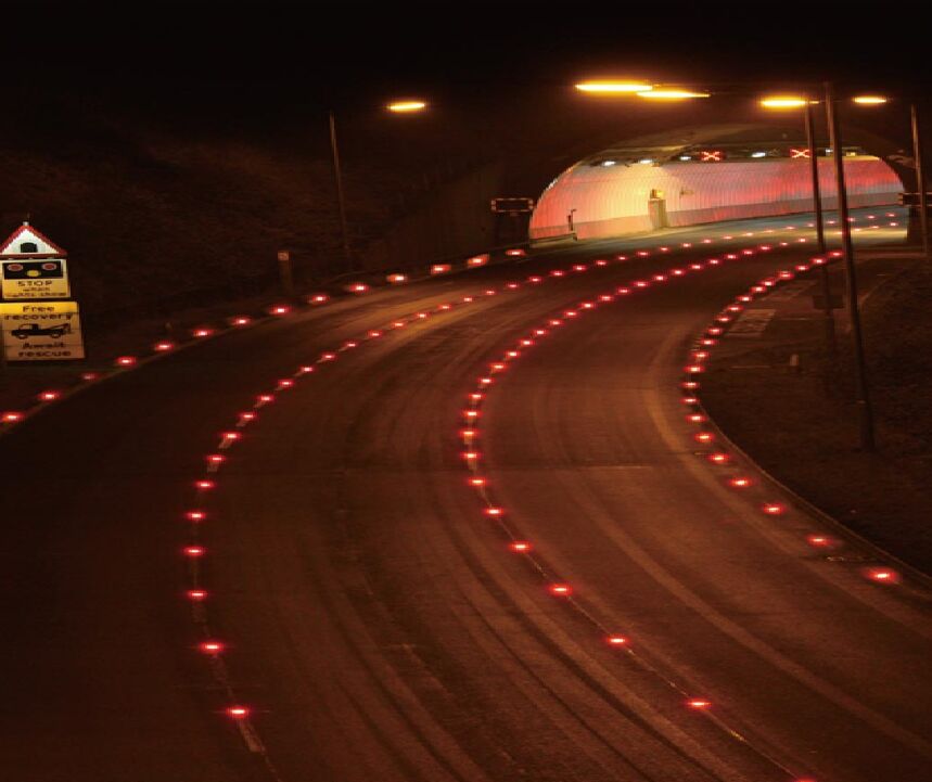 3、對于彎曲隧道路段應設置必要的視線誘導設施,如主動發光誘導設施等 。在隧道車道中心線以及兩側邊緣線上分別設置黃色與白色被動反光道釘,隧道兩壁附著主動發光輪廓標,提示駕駛人對向車道以及隧道墻壁的真實位置,消除緊張心理。